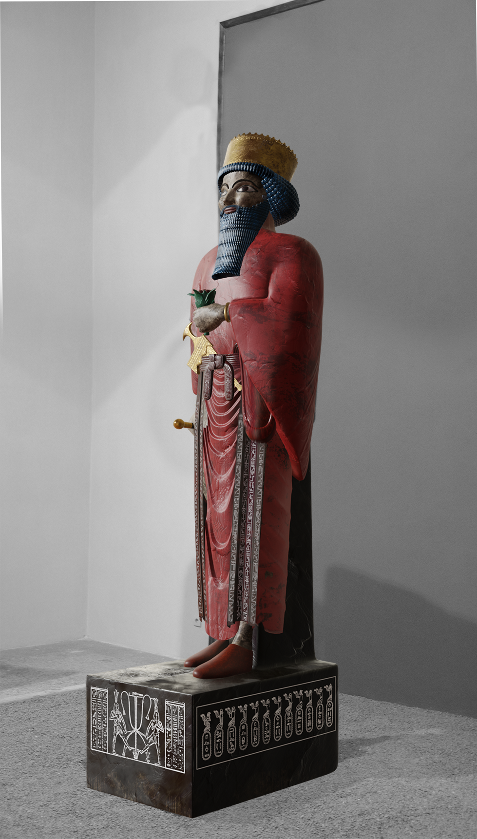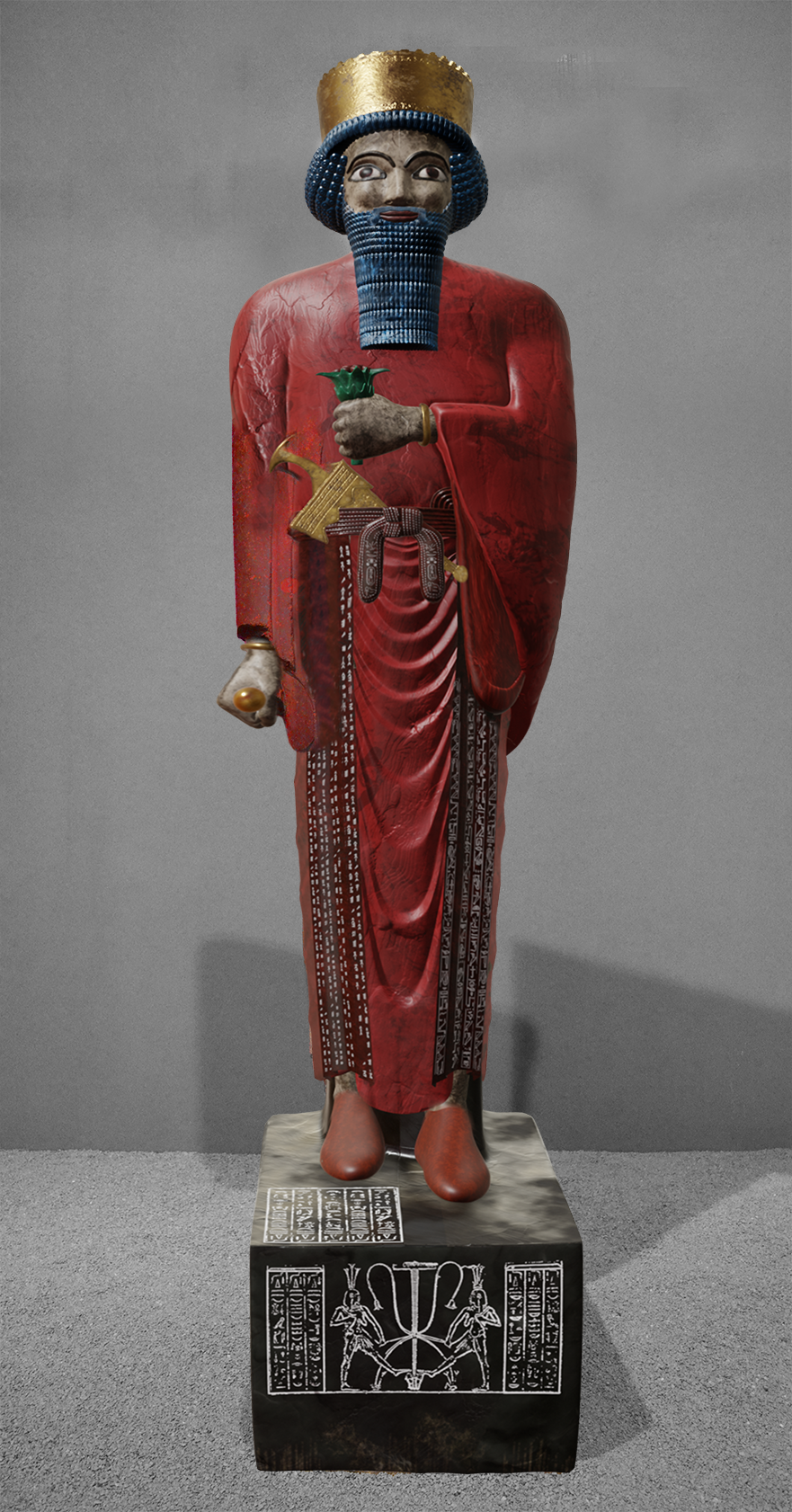 این مجسمه که داریوش اول را نشان میدهد در حین کاوشهای کاخ داریوش واقع در شوش توسط گروهی ایرانی-فرانسوی که ژان پرو آنها را هدایت میکرد، در سال ۱۹۷۲ کشف شد. این اثر از سال ۱۹۷۳ در موزه ملی ایران، بخش موزه ایران باستان نگهداری میشود. بر روی این مجسمه که در مصر حکاکی شده، تزئیناتی به خط هیروگلیف و بر روی آن نوشتههایی به خط میخی پارسی قدیم، ایلامی و بابلی وجود دارد که مشخص میکند مجسمه مربوط به داریوش بزرگ است. بازآفرینی این اثر توسط بردیا شیروانی بر اساس تحقیقات و پژوهشات دکتر شاهرخ رزمجو انجام شده است.
